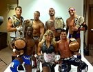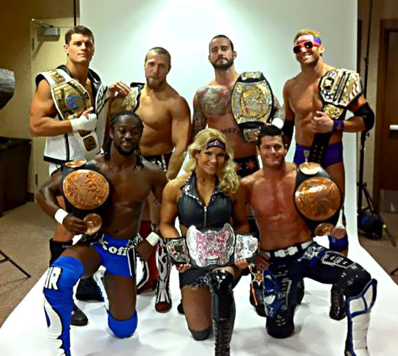 Légende: Cody Rhodes, champion intercontinental; Daniel Bryan, champion poids lourd; CM Punk, champion de la WWE, Zack Ryder, champion des Etats-Unis: Kofi Kingston, champion par équipe, Beth Phoenix, championne des Divas, Ecan Bourne, champion par équipe.