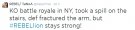"Lors de la Battle Royale des Knockouts à New York, je suis retombée sur les escaliers, me suis fracturée le bras, mais #REBELlion reste forte!"