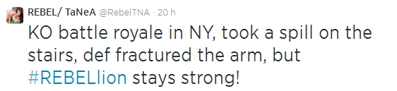 Sur son compte Twitter, la nouvelle Knockout de la TNA Rebel, qui fait partie du clan The Menagerie, a annoncé une blessure sérieuse à l'issue de son tout premier match pour la TNA, une Battle Royale des Knockouts lors d'un show enregistré en fin de semaine dernière à New York.