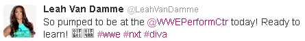 "Très excitée d'être au @WWEPerformCtr aujourd'hui ! Prête à apprendre ! #wwe #nxt #diva".