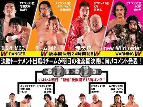 Demi-finale de la First Tag League Greatest: new WILD order (AKIRA et Manabu Soya) ont battu par tombé. Masayuki Kono et TAJIRI AKIRA et Soya se qualifient pour la finale.