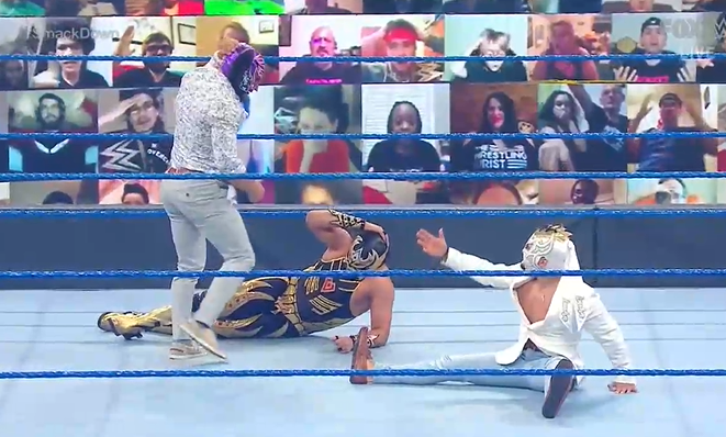 Jeff Hardy est revenu sur le ring et a frappé Sami et Styles avec un double Dropkick. Hardy grimpa jusqu’à la corde supérieure mais Zayn le poussa au sol. Styles a ensuite sorti Sami avec un Crossbody alors que SmackDown faisait une pause publicitaire.